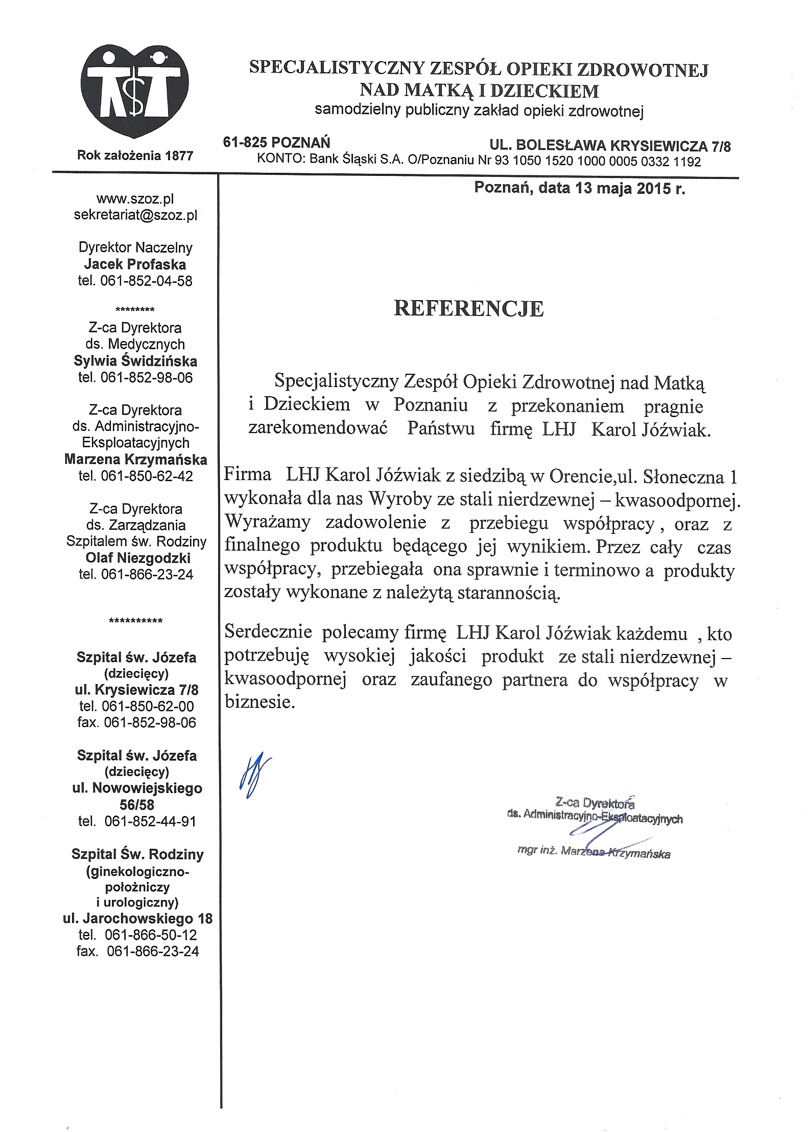 Serdecznie polecamy firmę LHJ Karol Jóźwiak każdemu, kto potrzebuję wysokiej jakości produkt ze stali nierdzewnej-kwasoodpornej ,oraz zaufanego partnera do współpracy w biznesie. Więcej… SZOZ nad Matką i Dzieckiem