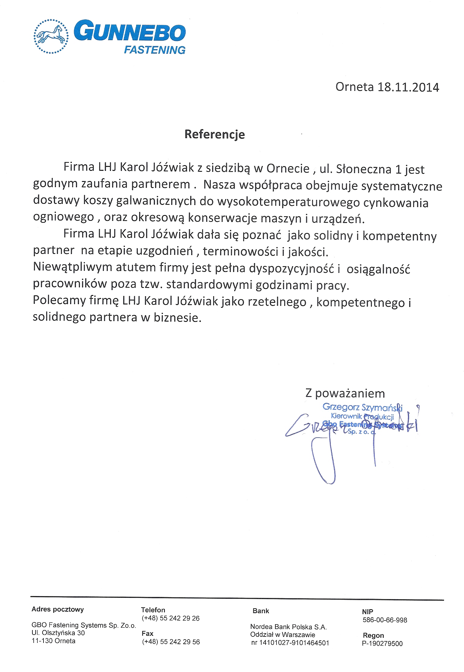Firma LHJ Karol Jóźwiak z siedzibą w Ornecie, ul. Słoneczna 1 jest godnym zaufania partnerem. Nasza współpraca obejmuje systematyczne dostawy koszy galwanicznych… Firma LHJ Karol Jóźwiak dała się poznać jako solidny i kompetentny partner na etapie uzgodnień, terminowości i jakości. Więcej… Gunnebo ab
