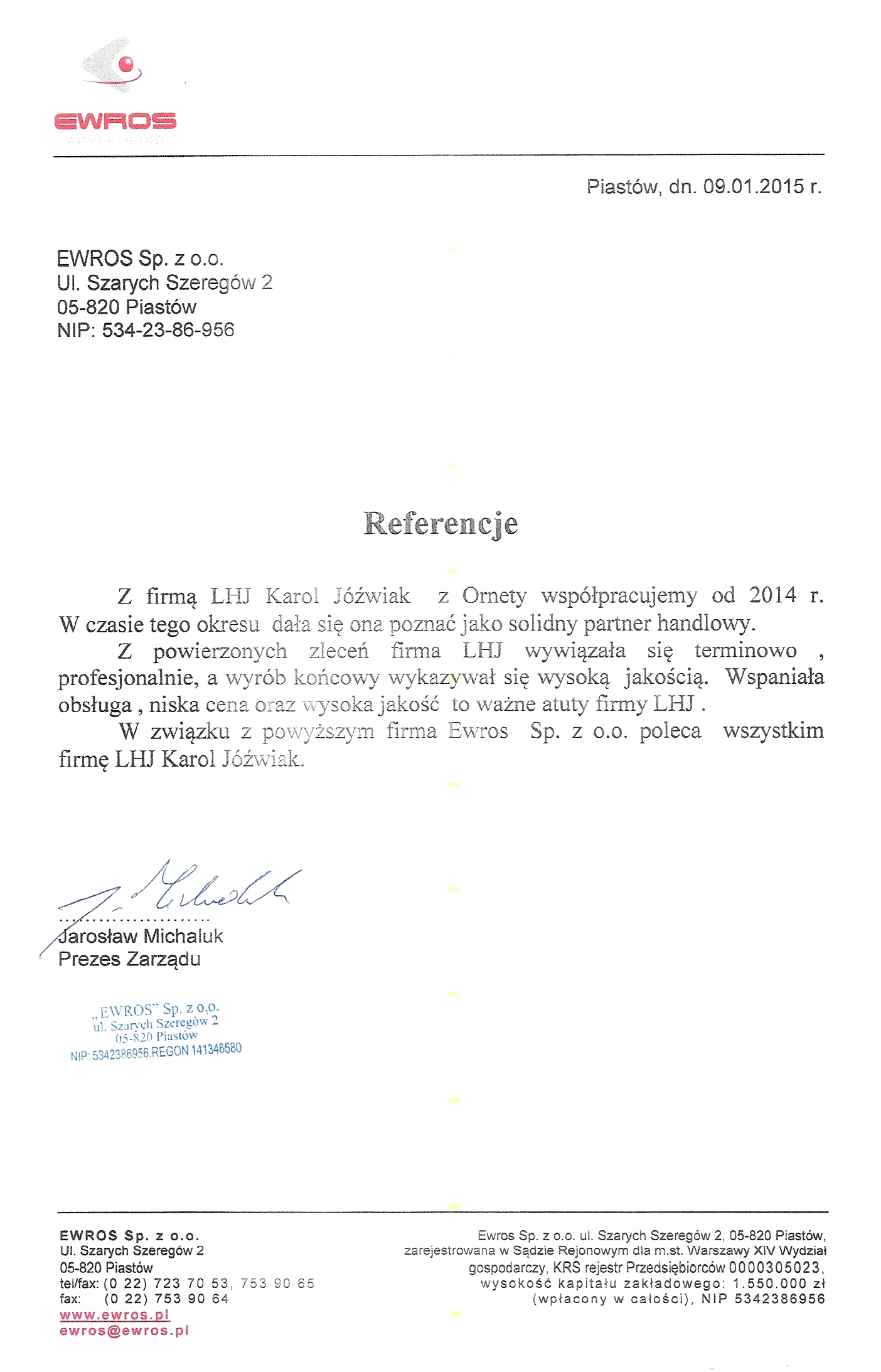 Z firmą LHJ Karol Jóźwiak z Ornety współpracujemy od 2014 r. W czasie tego okresu dała się ona poznać jako solidny partner handlowy. Więcej… Ewros